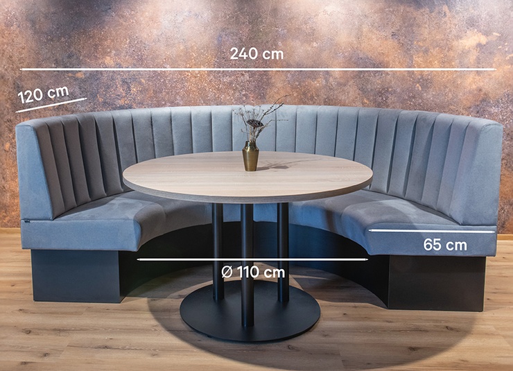 Vielseitig einsetzbar ist das Banksystem Felipa - bestehend aus 60er-Element, 120er-Element, Innenecke (70x70cm), abgerundete Ecke sowie Rundelemente. Die Elemente sind leicht verkettbar. Es gibt eine freistehende sowie eine Wandvariante mit Spannstoff auf der Rückseite. Das Gestell ist in Esstisch- und Stehtischhöhe erhältlich und kann mit unterschiedlich farbigen Füßen und Sockelblenden kombiniert werden. Sondergrößen auf Anfrage möglich.Artikelnummer