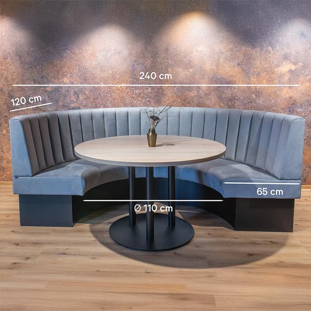Vielseitig einsetzbar ist das Banksystem Felipa - bestehend aus 60er-Element, 120er-Element, Innenecke (70x70cm), abgerundete Ecke sowie Rundelemente. Die Elemente sind leicht verkettbar. Es gibt eine freistehende sowie eine Wandvariante mit Spannstoff auf der Rückseite. Das Gestell ist in Esstisch- und Stehtischhöhe erhältlich und kann mit unterschiedlich farbigen Füßen und Sockelblenden kombiniert werden. Sondergrößen auf Anfrage möglich.Artikelnummer