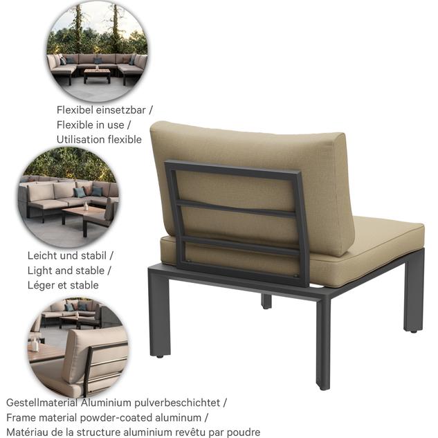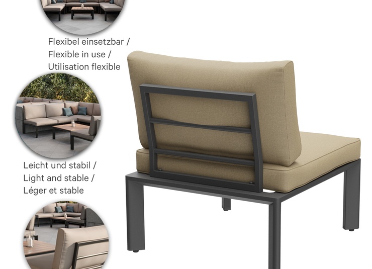 Geradlinig, schlicht, zeitlos – dieses moderne Lounge-System für den Außenbereich lässt sich auf Grund des zurückhaltenden Charakters in Form und Farbe stets passend in verschiedenste Umgebungen einsetzen. Klare Formen, ansprechenden Polsterelemente sowie ein ausgewogener Mix der Farben und Materialien gewährleisten eine einladende Optik. Die Sitz- und Rückenkissen sind mit einem abnehmbaren und waschbaren SUNBRELLA- oder LISO-Bezug ausgestattet. Sie sollten vor Nässe geschützt und bei Nicht-Gebrauch trocken gelagert werden. Bewahre die Kissen im Innenbereich auf und stelle vor dem Verstauen und Abdecken sicher, dass die Kissen vollständig trocken sind. Unser Outdoor-Stoff Liso aus spinndüsengefärbtem Acryl ist lichtecht, langlebig (20.000 Scheuertouren) und wetterbeständig. Der Stoff ist wasserabweisend (1.000 mm Wassersäule) und pflegeleicht dank Fleckschutz.Artikelnummer