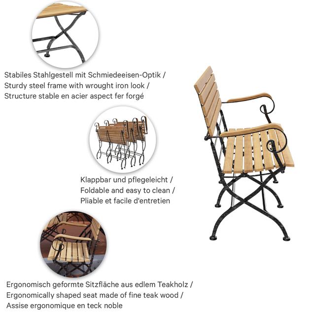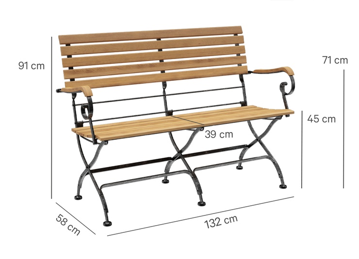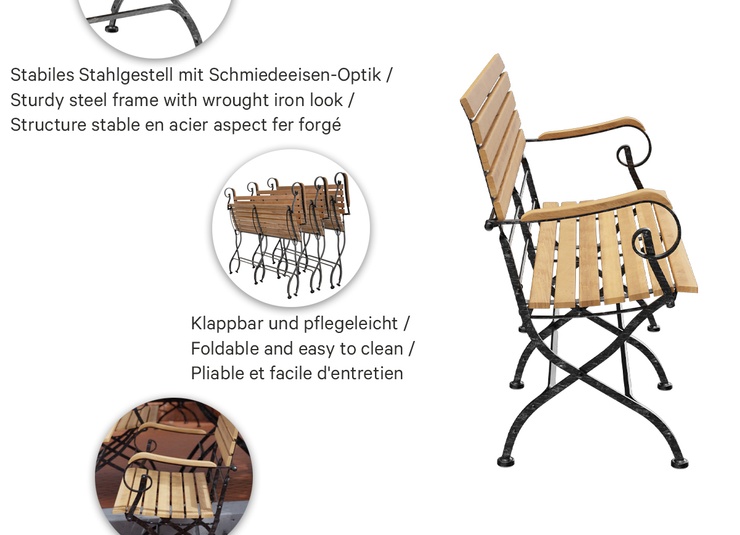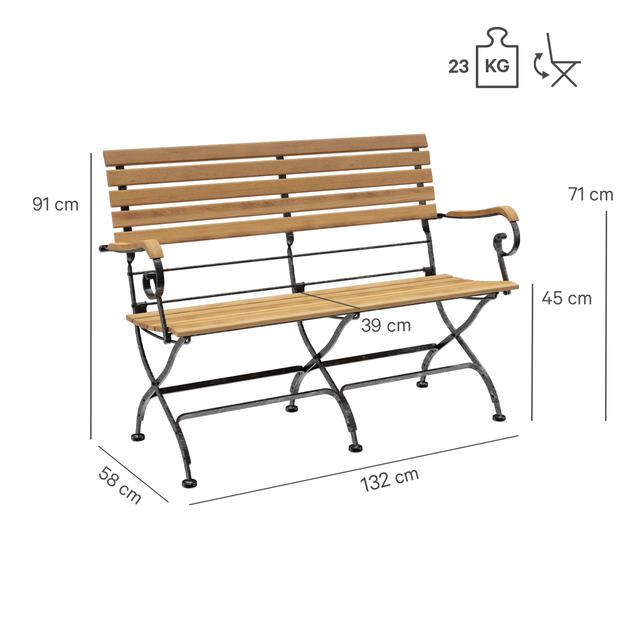 Die klappbare Bank Valentin ist eine klassische Biergartenbank mit Sitzfläche aus edlem Teakholz und stabilem Stahlgestell. Die schwarze Beschichtung mit silbernen Nuancen erzeugt einen Schmiedeeisen-Effekt und macht das Gestell zum optischen Highlight. Durch den optimierten Sitz-Rücken-Winkel und die ergonomisch geformte Sitzfläche bietet Valentin auch ohne Kissen einen äußerst bequemen Sitzkomfort. Die Bank ist in verschiedenen Längen sowie wahlweise mit oder ohne Armlehnen erhältlich. Praktisch im Handling: Valentin lässt sich schnell zusammenklappen, platzsparend lagern und ist dank der pflegeleichten Materialien bestens für den regelmäßigen Einsatz geeignet.- Edles Teakholz und stabiles Stahlgestell mit Schmiedeeisen-Optik