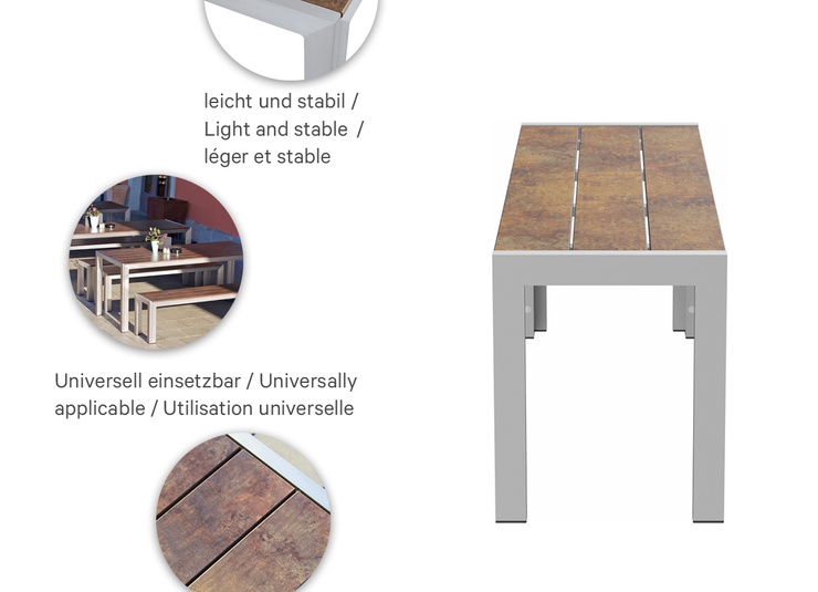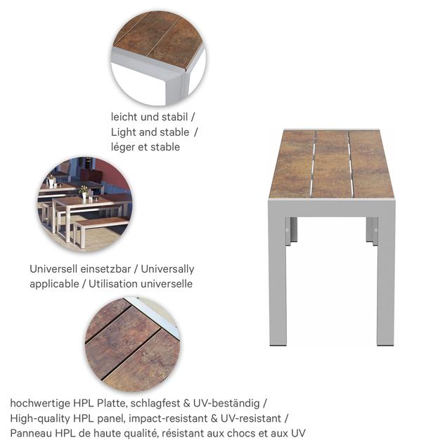 Geradlinig und modern ist das massive Tisch-Bank-Set Torger. Es ist in zwei verschiedenen Größen und in den Farben Phoenix braun und Rabac verfügbar. Das Aluminiumgestell ist silber oder anthrazit pulverbeschichtet, die Platten und Sitzflächen bestehen aus hochverdichtetem Schichtstoff. Die vielseitige Compact Slim Platte ist sowohl für den Einsatz im Innen- als auch im Außenbereich ideal geeignet. Die Oberfläche besteht aus pflegeleichtem, hochverdichtetem Schichtstoff (HPL), der UV-beständig ist und durch seine Robustheit überzeugt. Die Platte erfüllt die Anforderungen der DIN EN 438, die für Küchenarbeitsplatten gilt, und bietet außergewöhnliche Widerstandsfähigkeit. Zudem ist sie schlagfest und somit perfekt für anspruchsvolle Anwendungen geeignet.