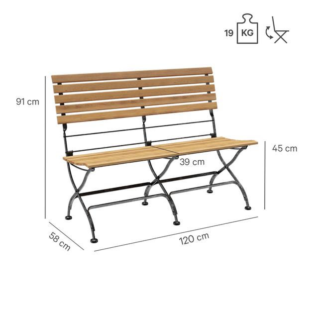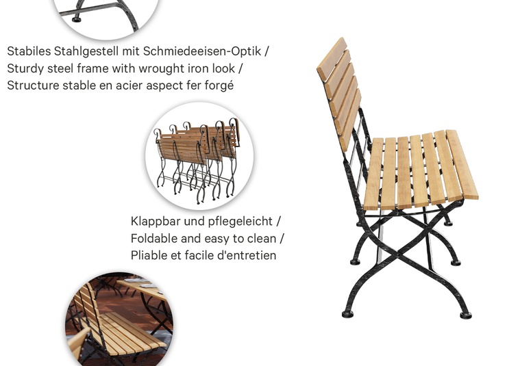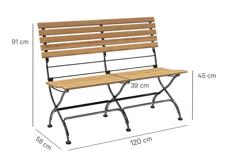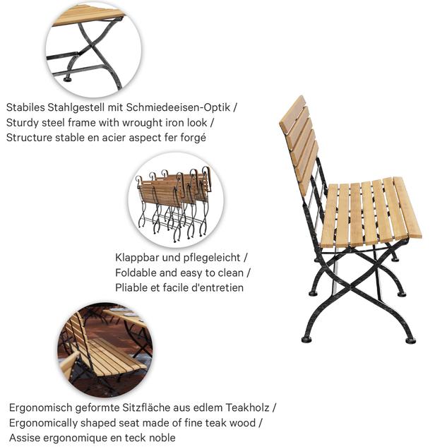 Die klappbare Bank Valentin ist eine klassische Biergartenbank mit Sitzfläche aus edlem Teakholz und stabilem Stahlgestell. Die schwarze Beschichtung mit silbernen Nuancen erzeugt einen Schmiedeeisen-Effekt und macht das Gestell zum optischen Highlight. Durch den optimierten Sitz-Rücken-Winkel und die ergonomisch geformte Sitzfläche bietet Valentin auch ohne Kissen einen äußerst bequemen Sitzkomfort. Die Bank ist in verschiedenen Längen sowie wahlweise mit oder ohne Armlehnen erhältlich. Praktisch im Handling: Valentin lässt sich schnell zusammenklappen, platzsparend lagern und ist dank der pflegeleichten Materialien bestens für den regelmäßigen Einsatz geeignet.- Edles Teakholz und stabiles Stahlgestell mit Schmiedeeisen-Optik