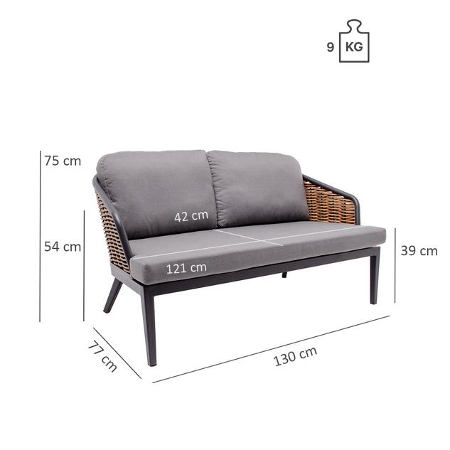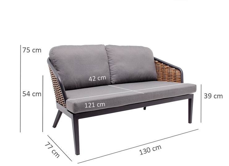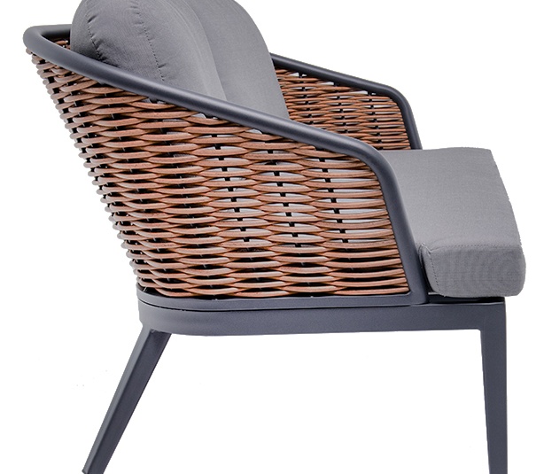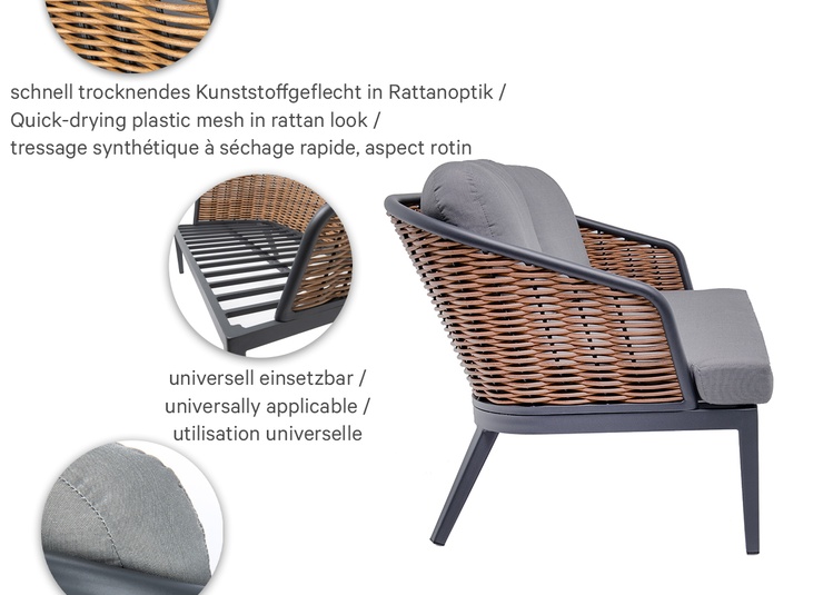 Unsere stilvolle Lounge Serie Somaro, bestehend aus Sessel und 2-Sitzer bieten höchsten Komfort und sind speziell für den Gastronomiebereich konzipiert. Das wetterfeste Kunststoffgeflecht in Rattan-Optik und das stabile Aluminiumgestell sorgen für Langlebigkeit und Widerstandsfähigkeit. Die hochwertigen, abnehmbaren Agora Liso Kissen sind waschbar und besonders pflegeleicht. Dank der idealen Größe des 2-Sitzers lassen sich kleine Gruppen flexibel arrangieren und eine einladende Atmosphäre schaffen. Unser Outdoor-Stoff Liso aus spinndüsengefärbtem Acryl ist lichtecht, langlebig (20.000 Scheuertouren) und wetterbeständig. Der Stoff ist wasserabweisend (1.000 mm Wassersäule) und pflegeleicht dank Fleckschutz.Artikelnummer