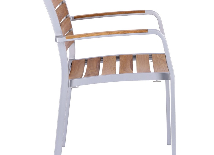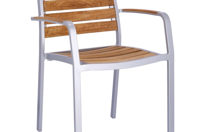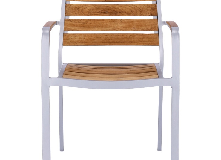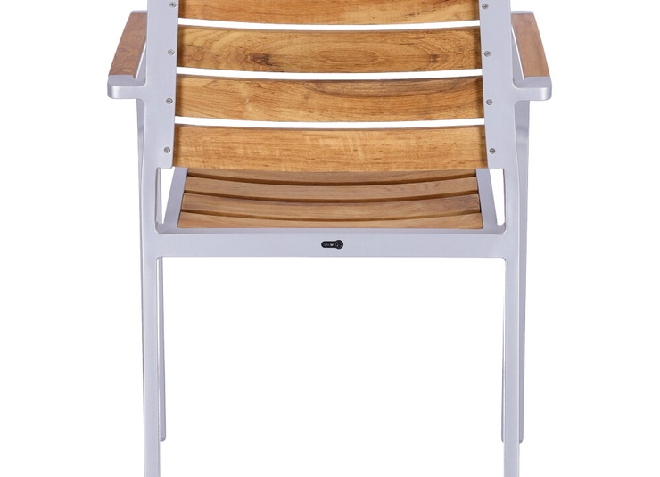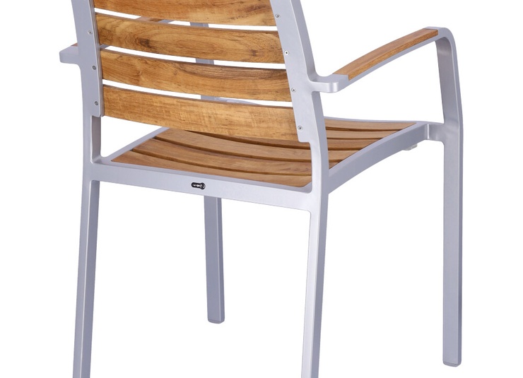 Für Naturverliebte ist der stapelbare Stuhl Verio die richtige Wahl. Das Aluminiumgestell ist pulverbeschichtet in Silber oder Schwarz, pflegeleicht und wetterfest und kontrastiert elegant mit Sitz und Rücken aus unbehandelten Teakholzleisten. Die Massivholzleisten sind in Sitz und Rücken ergonomisch geformt und sorgen für angenehmen Sitzkomfort. Teak ist unempfindlich, kann ganzjährig im Freien verbleiben und entwickelt unbehandelt eine edle, silbergraue Patina. Wer den gelbbraunen Farbton erhalten möchte, sollte die Flächen vor dem ersten Einsatz ölen und die Behandlung regelmäßig auffrischen. Ideal für flexible Outdoor-Bereiche: Verio ist stapelbar.- Leicht und stabil
