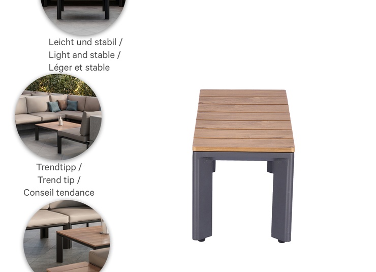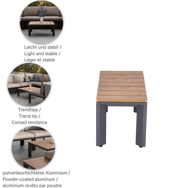 geradlinig, schlicht, zeitlos – dieser moderne Beistelltisch für den Außenbereich lässt sich auf Grund des zurückhaltenden Charakters in Form und Farbe stets passend in verschiedenste Umgebungen einsetzen. Klare Formensprache sowie ein ausgewogener Materialmix von Metall und hochwertigem Kunstholz gewährleisten eine einladende Optik.Artikelnummer