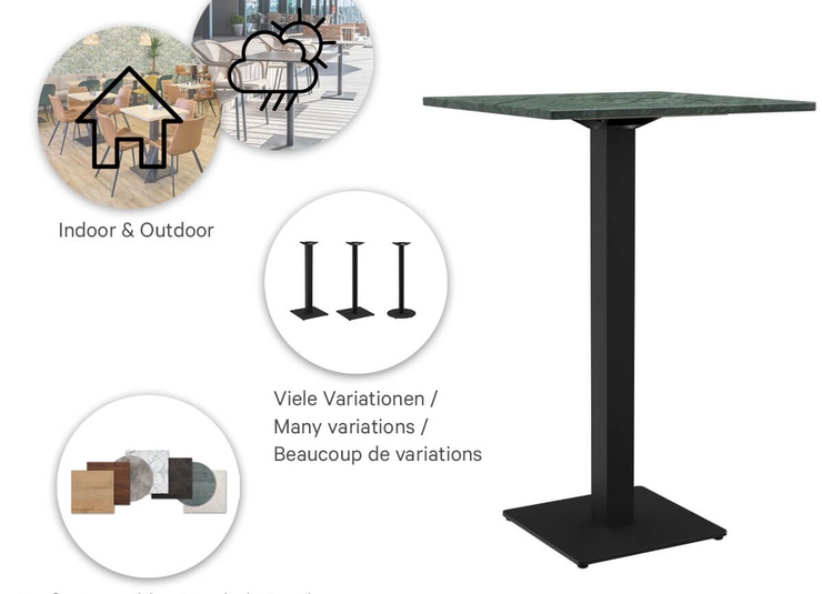 Rund, eckig - hoch, niedrig - groß, klein: Kerst zeichnet sich durch eine große Variantenvielfalt aus. Das Gestell aus pulverbeschichtem Stahl in Schwarz oder Edelstahl kann mit verschiedenen Tischplatten kombiniert werden und ist mit manuellen Verstellgleitern ausgestattet. Durch die Zusammenstellung von eckigen Füßen mit runden Säulen entstehen interessante Kontraste.Artikelnummer
