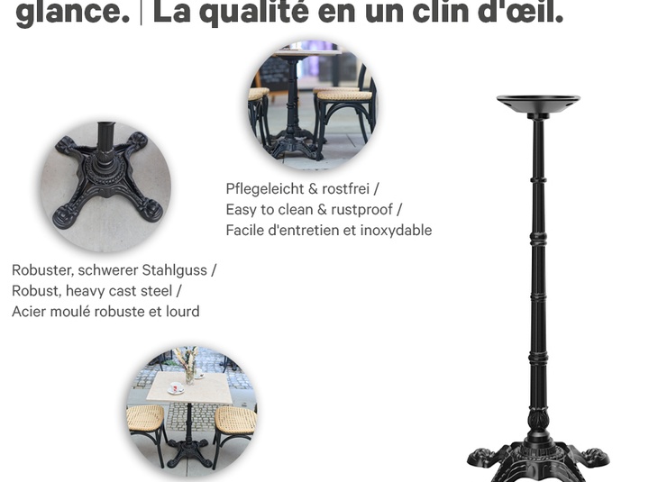 Auf vier Füßen steht das Modell Venera als Ess- oder Stehtisch, das zum beliebten French Bistro-Look passt. Das Gestell ist aus schwarzem Stahlguß gearbeitet. Kompatibel ist das Modell mit runden Platten mit einem Durchmesser von 50 bis 80 cm und mit quadratischen Platten von 50 x 50 cm bis 80 x 80 cm.Artikelnummer