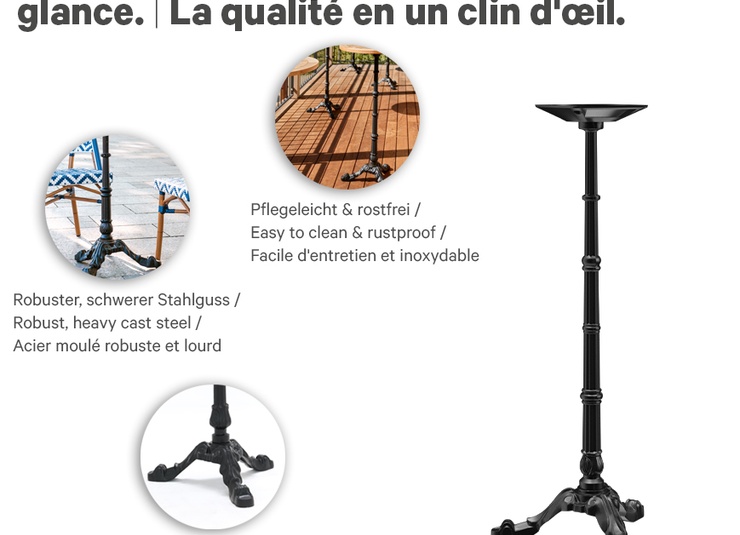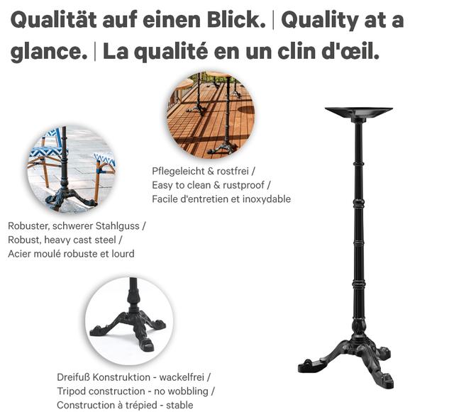 Ein Vertreter des beliebten French Bistro-Looks ist das Modell Verma, das als Ess- und Stehtisch erhältlich ist. Das dreifüßige Gestell ist aus schwarzem Stahlguß gearbeitet. Verma ist als Esstisch kompatibel mit runden Platten mit einem Durchmesser von 50 bis 60 cm und mit quadratischen Platten im Format 50 x 50 cm.Artikelnummer