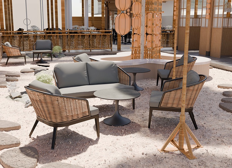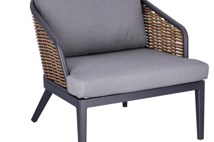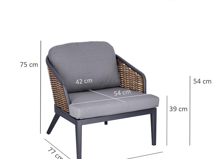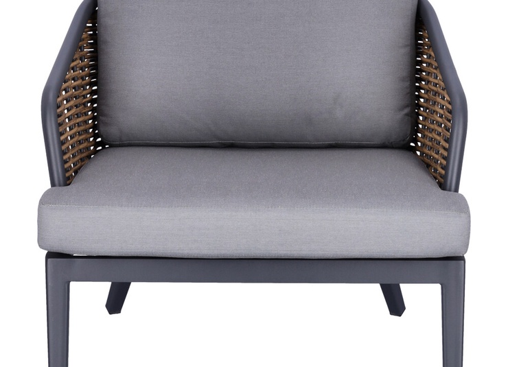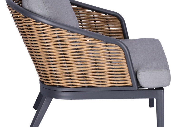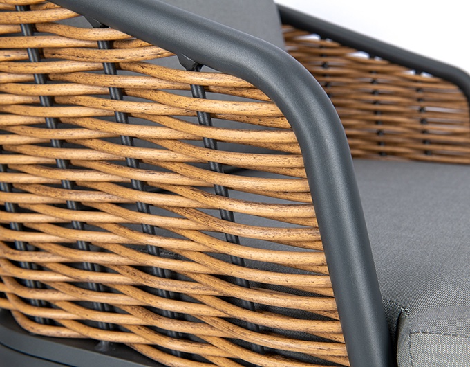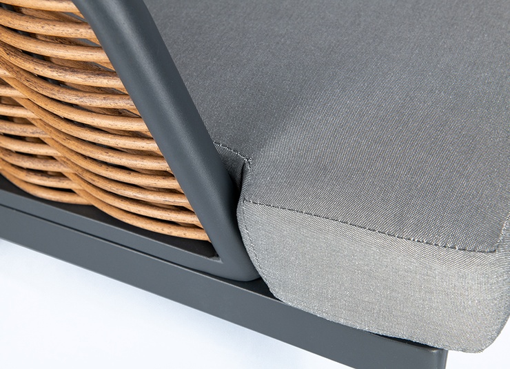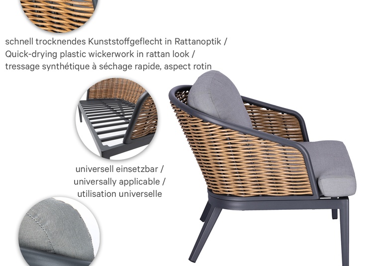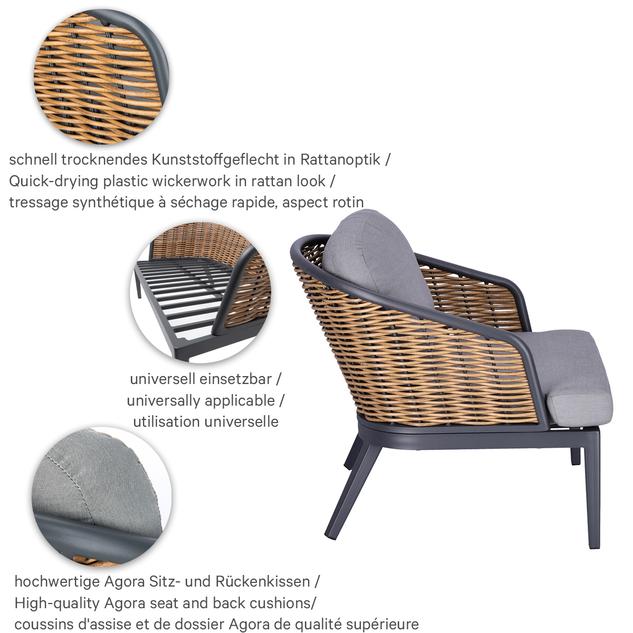 Unsere stilvolle Lounge Serie Somaro, bestehend aus Sessel und 2-Sitzer bieten höchsten Komfort und sind speziell für den Gastronomiebereich konzipiert. Das wetterfeste Kunststoffgeflecht in Rattan-Optik und das stabile Aluminiumgestell sorgen für Langlebigkeit und Widerstandsfähigkeit. Die hochwertigen, abnehmbaren Agora Liso Kissen sind waschbar und besonders pflegeleicht. Dank der idealen Größe des 2-Sitzers lassen sich kleine Gruppen flexibel arrangieren und eine einladende Atmosphäre schaffen. Unser Outdoor-Stoff Liso aus spinndüsengefärbtem Acryl ist lichtecht, langlebig (20.000 Scheuertouren) und wetterbeständig. Der Stoff ist wasserabweisend (1.000 mm Wassersäule) und pflegeleicht dank Fleckschutz.Artikelnummer